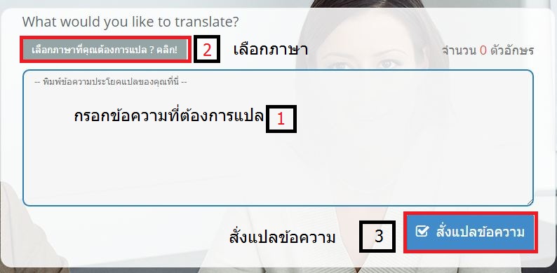 กรอกข้อความที่ต้องการแปล แล้วเลือกภาษาต้นฉบับ ภาษาปลายทาง จากนั้นกดประเมินราคา แล้วชำระเงินจากนั้นนักแปลจะเริ่มดำเนินการ
